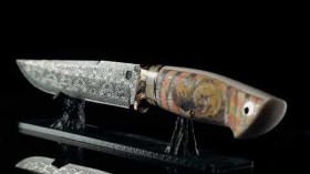 Авторский нож Охотник (сложный мозаичный дамаск, стабилизированный бивень мамонта, незильбер)